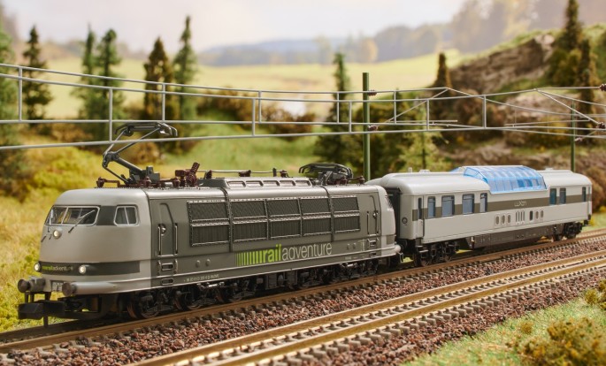 Der MINITRIX-Zug beseht aus zwei Artikeln. Der Lok der Baureihe 103 (Art. 16346) und dem Aussichtswagen (Art. 18429)