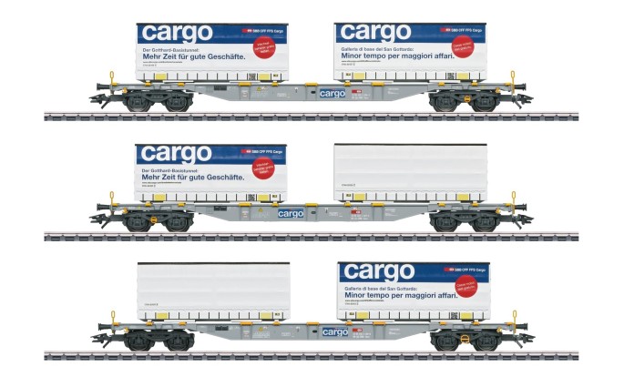 Das H0-Wagenset enthält 3 Tragwagen des Typs Sngss, die jeweils 2 Wechselbrücken der SBB Cargo oder der Firma Esch tragen.